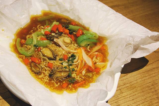 用鲜甜的纯蟹肉和小鲍鱼+方便面搭配丝瓜,口感非常鲜美,特别是方便面,火候恰好,第一次吃泡面有Q弹润滑的感觉,和盆友一致好评。