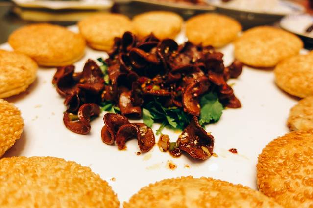 外面是烧饼,中间是腰片,是将腰片夹在烧饼里吃的,不过我更喜欢吃这个烧饼,直接吃就已经很香了。