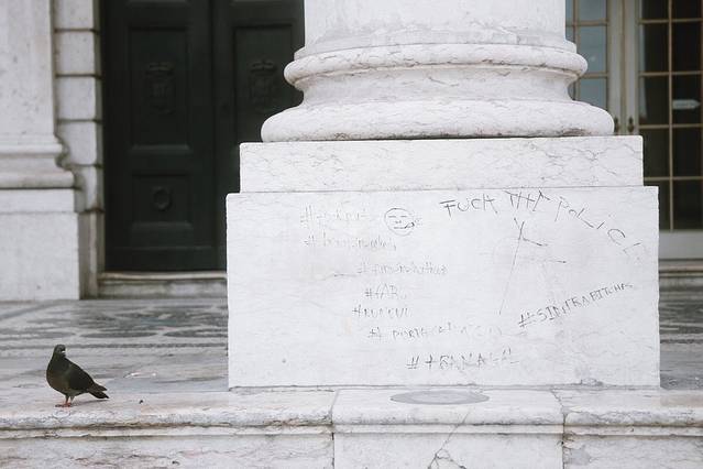 出于专业的条件反射,十分钟爱建筑上的精美雕塑。X同志好奇大地震是如何没有将 石柱 上的雕刻震下来,我只是让他仔细看建筑上的石雕。巴 洛克 式的雕花并不是贴上去的,而是用一整块石块一凿子一凿子凿出来的!不知道和当时 中国 的长城相比,消耗了多少人力。外墙面打磨得光滑平整,白色花岗岩十分高大、圣洁。右边这一半今年刚翻修完,所以看上去更加白一些。