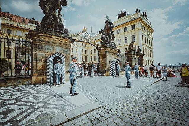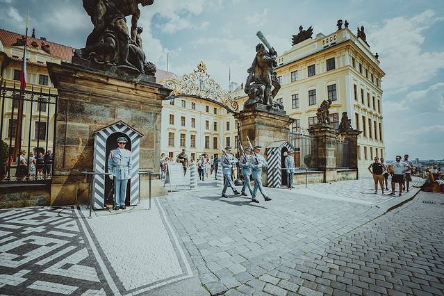 △ 布拉格 市政府也坐落在城堡区,卫兵换岗是一到风景线,虽然不像我们天安门那么威武雄壮,但是也很有特色。最初由一名卫兵长领两名士兵正步走出,然后左右交换,卫兵交班全程没有一句对白,以步枪托跺地发出清脆的声音为信号进行交流,换岗完成,卫兵长再领头带回两名换班士兵。