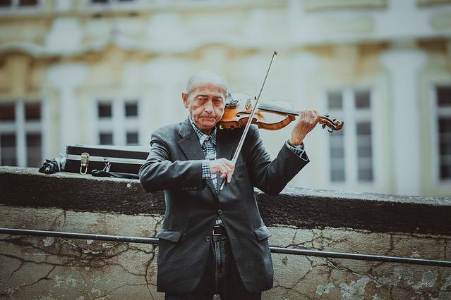 △ 徒步下山,街头一位拉小提琴的卖艺老人,目测他的小提琴是一把古琴,音乐浑厚悠扬。