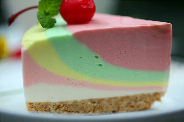几种颜色的奶油混合,吃起来像是酸奶的味道。彩虹色的食物一如既往的可以给人好的心情,遇到彩虹,吃定彩虹,