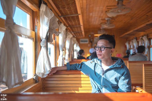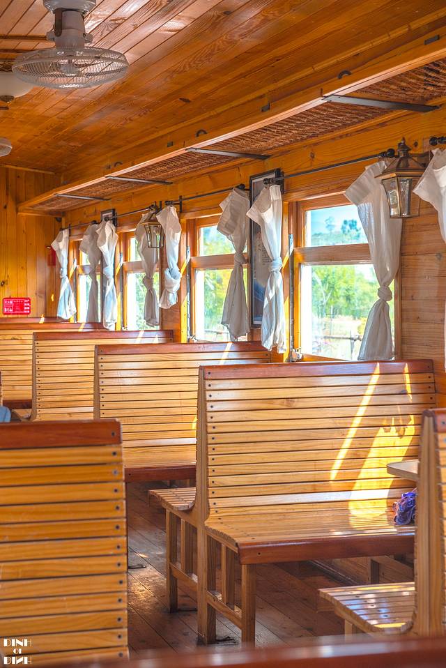 橙黄色的小火车,车厢内全是木质结构的座椅,每个窗户都可打开两旁挂着白色的窗帘,