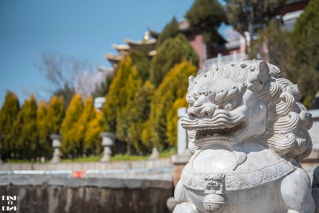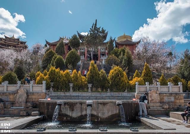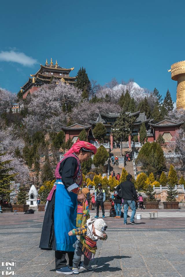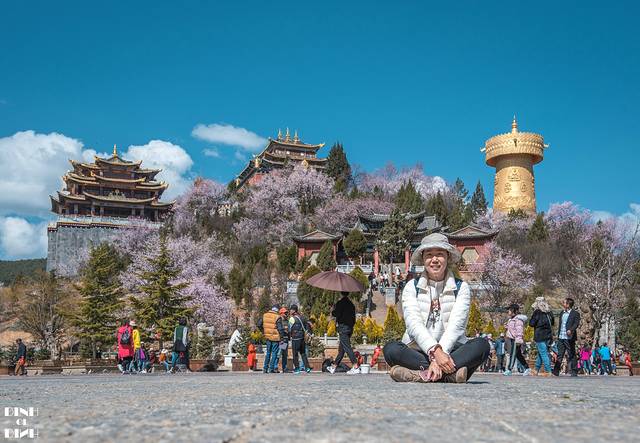 爬到一半就可以看到樱花的身影了,中式的屋檐加上樱花的点缀,背景是高原特有的蓝天白云