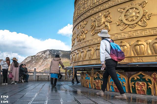 爬到山顶可以俯瞰整个香格里拉县城,山顶还有世界最大的转经筒