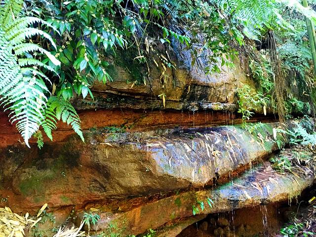 进门处不远,就有一个小小的天生桥,水流涤穿了石洞,脚下生长着茂密蕨类植物和桫椤。