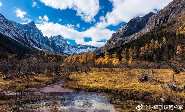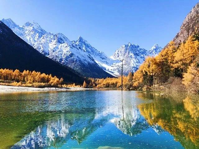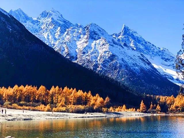 漫步在卓玛滩的沙滩上,一排排金黄的落叶松映入眼帘,皑皑雪山就矗立在面前。蓝天、雪山、彩林、湖泊在眼前交相辉映。