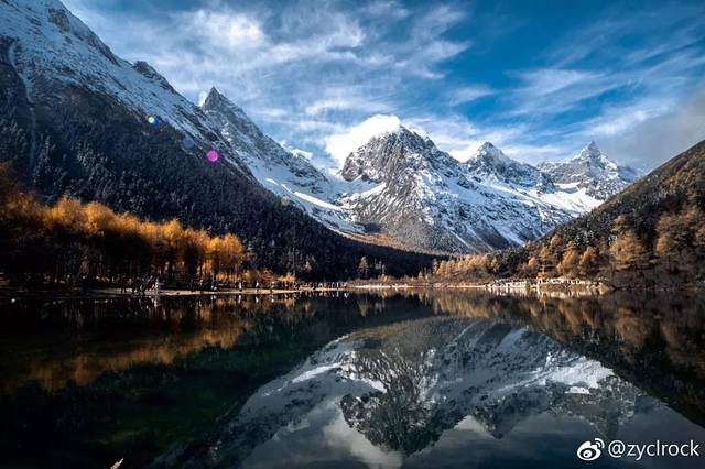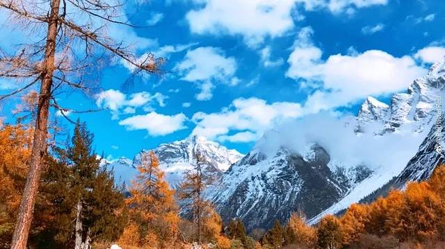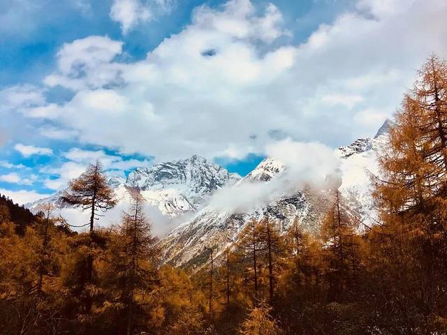 抬头一望,天边染白了头的雪山和浓烈的彩林遥遥呼应,天空湛蓝白云漂移,画面静谧且安详,一切如同进入梦幻中的仙境!