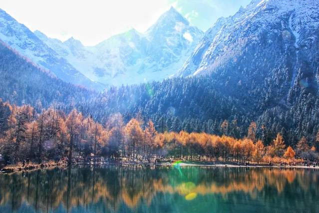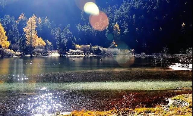 这里海子和林海相接,雪山和温泉共存。艳阳高照的晴天,一束阳光洒落进海子,泛出粼粼的波光,使原本宁静的水面霎时间斑驳陆离起来。