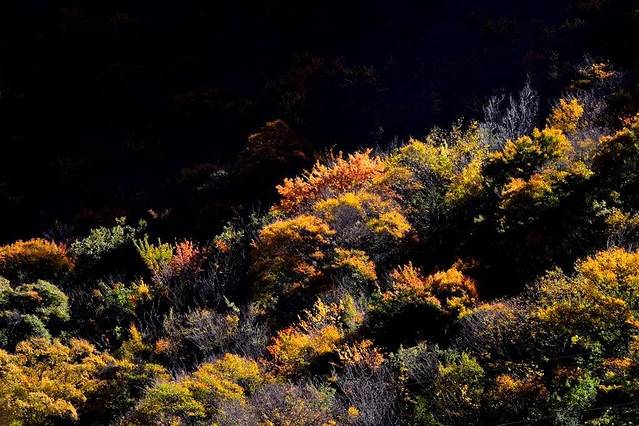 秋天的毕棚沟,没有萧瑟,也没有凄凉,而是层林浸染的耀眼夺目,遥遥望去,好似一幅浓墨重彩的斑斓油画,让人无限心醉。