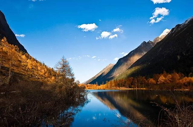 清澈见底的湖面,彩林倒映在湖中,给湖水也染上一抹金黄,蓝天白云的影子也在湖底“游动”,咔嚓一下,就是海天一色的摄影大片!