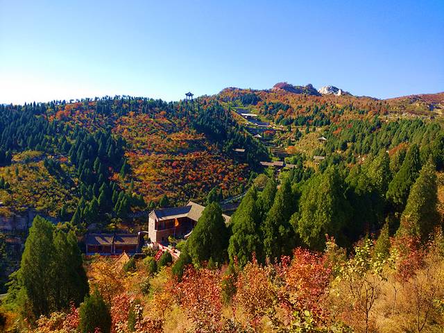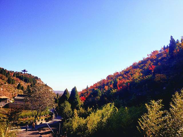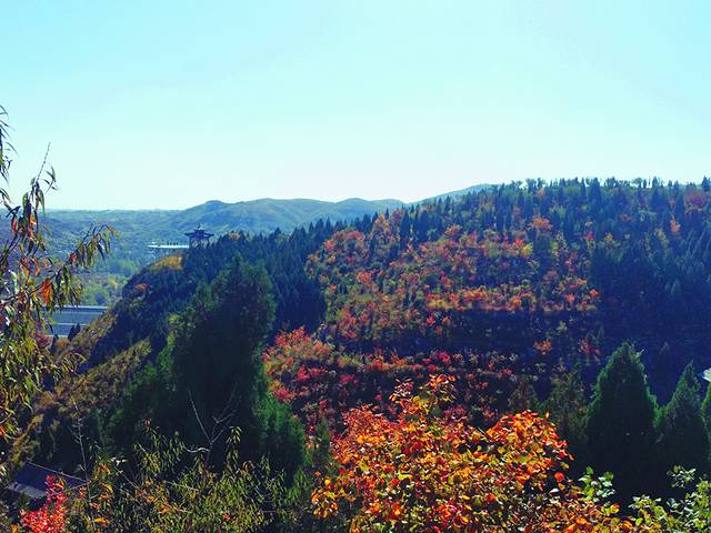 长春观的秋景散发着一股成熟的味道。苍山群群,层林尽染,层层叠叠的树木和这被秋风洗过的蓝天,美的仿佛一幅流动的油画,色彩浓郁,画风温暖。