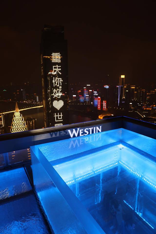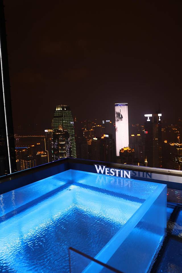 我来之前其实已经规划好我要去的地方了,吃完饭已经8点半了,其实我来很想看抖音里的郑美丽唱歌,因为比较火我也知道去了应该没地方,然后就晚点去,我们回到了酒店因为想打个卡,在威斯汀酒店的54层有一个游泳池很漂亮,是一个网红地,可以看到一半重庆夜景,然后我们俩溜达走回了酒店。