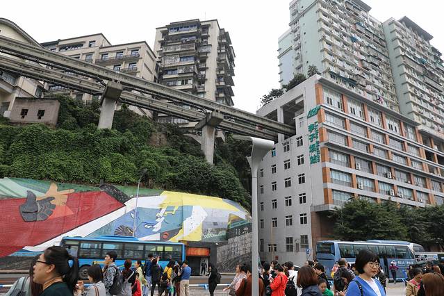 简单的吃完我们沿着瓷童路去找地铁,来到这个城市一定要体验一下过山车式的地铁,你会发现很有意思,从山洞到过楼再到嘉陵江上,看遍这个城市,从磁器口出来路边有光观大巴,如果假期时间充裕可以办一张一天卡,24小时可以随时随地乘坐光观大巴,只要在指定的站口,会带你去重庆的各个景点。天票30,一次门票上20.因为时间有限没去长江索道,还有好多景点,挺可惜,不过这几个地方也很好了,瓷童路是一个大上坡,越往上走回头就能看到城市的风景,马路两旁都是小吃和卖重庆特产麻花和火锅底料,在重庆让我想起了在香港,这个城市更有特色一点,基本上没有平路,都是有坡度,最大的坡度快90度了,感觉自己岁数都大了走不动,走了有一千米找到了地铁口,排了人工窗口主要是问一下怎么转地铁到李子坝站,我以为会很贵,比广州地铁便宜很多,忽上忽下的感觉真的像过山车一样,透过窗外你可以看到30层楼与你平行,透过嘉陵江可以看到其他的地铁线来回穿梭,