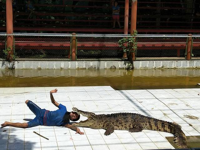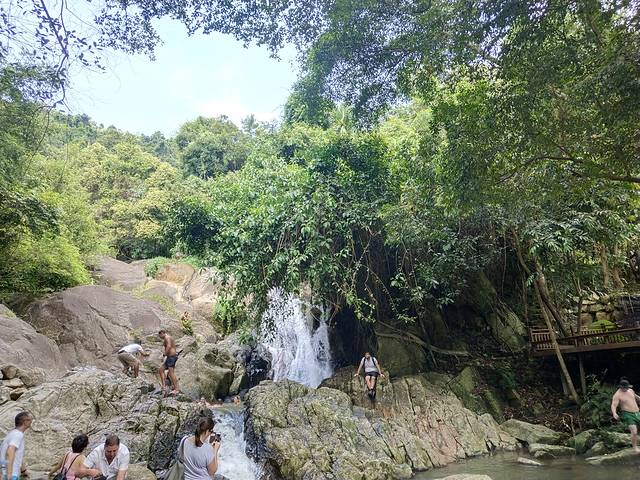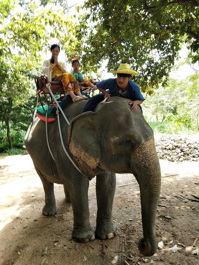 第二天7点起床,收拾好东西去吃早餐,然后8点半在酒店大堂等,差不多10多分钟后车来接了,一路又接了一个老外、一对中国情侣,福建的,说能听懂我们的四川话,还有之前上车的一对外国情侣。一个越野车很宽敞,与其说是越野其实更像我们成都的大型三轮货车,两张长凳对着那种,车厢敞开的。先后去参观了金色大佛、阿公石阿母石,不得不感叹自然界的神奇力量,居然是天然的。然后就去了丛林,观看大象、猴子、鳄鱼表演,这个小朋友最喜欢。期间遇到一对外国夫妇带着两个女儿,大的坐在婴儿车里,估计也就2岁,小的妈妈抱着,看样子不足3个月,两个孩子跟妈妈一样瘦,一直哭,不得不感慨外国人观念就是不一样,这么小的孩子带到外面来,还这么大太阳。这里想提下大象表演,虽然我全程没怎么听懂工作人员的英语,但通过他的手势以及表演过程,不得不感慨异国文化,虽然谈不上色情,但画面多少有点少儿不宜。哪怕一个人旅行我也不想去芭提雅,是觉得人妖表演没看头,过于色情,曼谷比较适合信佛的人,所以我选择苏梅,纯休闲的。午餐是表演结束后在那用的自助餐,出门前特意去买了一瓶老干妈带着,结果根本不需要,连妈妈都适应这的口味,午餐味道感觉比酒店的还好。午餐后直接去骑大象,之前还想说服妈妈一起,刚坐上去我就想,幸好我妈没来。太吓人了,凳子没有安全带,也没栏杆,靠椅很短,如果大象不高兴随时会摔下一层楼高,刚坐上去就觉得坐不稳,一直晃,还好大象开始走了反而平稳了。给了200铢的小费,半路停下帮我们拍了好些照片,女儿很兴奋,可能是我们去的时候不是旺季,刚好下午人也少,坐大象没怎么等,全程可能坐了15分钟,有点意犹未尽。然后上山(Namuang)去看所谓80米高的瀑布,说实话,我没看出来有80米,感觉十来米,很多老外在瀑布下的池子里游泳,下面还有泡脚的,拖了鞋坐在那,小鱼一会就过来给你挠痒痒了,天然的鱼疗。而后就去了木乃伊寺庙、后山佛像园,都没什么看头,最后到了山顶,据说可以看见半个苏梅,没觉得有多美,还没在女神山上看到的泸沽湖美。上下山都有一段没有开发的山路,坐着挺抖,身体不好的人小心。导游说可以轮流坐车上观光,可我们那车人也只有3个老外上去了,我本来也想去,导游说孩子也没问题,可我妈不让,有点遗憾。坐着越野环岛的风景也不错,如果再慢点就更好了,回到酒店才5点,小朋友一回去就坐不住,穿上泳衣又去玩了,没有节制导致在苏梅的第3天感冒了,一直流着鼻涕。今天的行程是大人260一人,小孩240一人,偏贵。