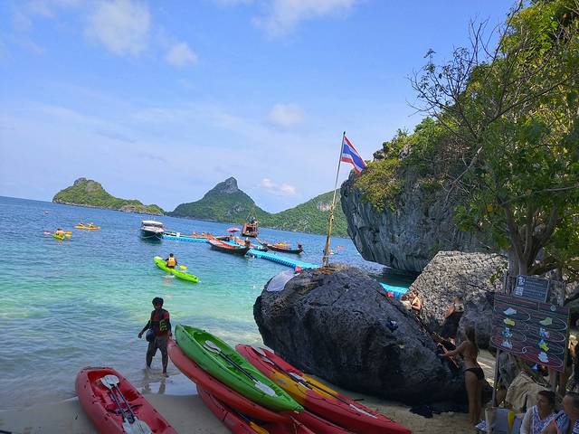 这天我通过携程订的,反正在导游那最后也是拼团,还贵。携程上双层大船+浮潜是158/人,小孩118,另外一起给了750铢的上岛费。犹豫了很久,最后没有订皮划艇,说实话很想尝试,可我不会游泳,又单独带着孩子,皮划艇也要去深水区,想想都害怕,出来旅行没有男伴陪同确实也是一个问题,另一个问题就是我也该好好学习下游泳了,怎么也是一项求生技能。船上准备了简单的早点,起晚的可以凑合下,碰到几个绵阳江油的,一路也有个伴,今天的导游全程英文,有点难懂,还有一群法国人,很有礼貌,还给我们让座,不得不说人家法国人挺开放的,当着一船的人,老公给穿着比基尼的老婆屁股上擦着防晒霜,其实也就中国人看着,其他人都觉得很正常。到了安通国家公园,小船过来接的,靠了岸,工作人员一路扶着我妈上岸,从船到岸边是一片塑料,踩着不稳,慢慢走还是没问题,这里必须得给工作人员点赞,没有嫌麻烦,那么长一段路把我们三人送过去。我们没有去爬山,找了个地方坐着乘凉,然后和几个江油人一起去浮潜,这里的浮潜何我想象的不一样,就是穿着救生衣,带着吸嘴,没有人指导,自己跳下去,我们只在浅水区,刚下去就喝了口海水,也是来3天第一次下海,我和孩子都用不来,只好当穿着救生衣游泳了,海浪有点大,怕把我们卷过去,也只在膝盖深的地方玩。就这样孩子都觉得挺好玩。12点半上船午餐,然后开往帕雷岛,有皮划艇项目的提早下船,乘坐小船去另一边划船过去。这次妈妈没有下船,和一个江油阿姨坐船山休息,有一群韩国老太太也没下船,女儿想去玩,我们事先说好不下水了,这天出来后她一直流鼻涕,我们什么也没带就下船了,最后下去,结果小船成了专船,只拉了我们俩。上岛后看见别人下水她又坐不住了,冰淇淋也说服不了她,岛上的商店有男装卖,偏就没女装,一听说不能下水她“哇”地一声哭了,所有人都看着她。同行的江油阿姨跟我说小女孩没事,就让她穿着小内裤下去吧,然后把她的泳衣借给我了,人家都这么说了我也不好再拒绝,反而好像是我嫌弃了,只好依着孩子第二次下海,事先约定只玩10分钟,还好最后叫她上来时没有再闹。帕雷岛上没有热水,最后将就卫生间的凉水冲了下,两次下海我的头发打湿了两次,风吹干了两次,直接导致我也感冒了,回去路上一直觉得头昏脑涨,孩子就流鼻涕。下船后有司机拿着写有酒店名字的牌子接人,6点我们回到酒店,这次出来没带药,也不敢出去随便买,还好孩子没什么事,我在餐厅点了壶姜茶送来,喝了茶睡了会才带着妈妈、孩子去吃饭。晚餐我们逛去了酒店右边一条路,这边酒吧挺多的,吃的选择范围较小,点了两个套饭,分了点给孩子,身体不舒服也没胃口,简单用过晚餐回酒店休息。