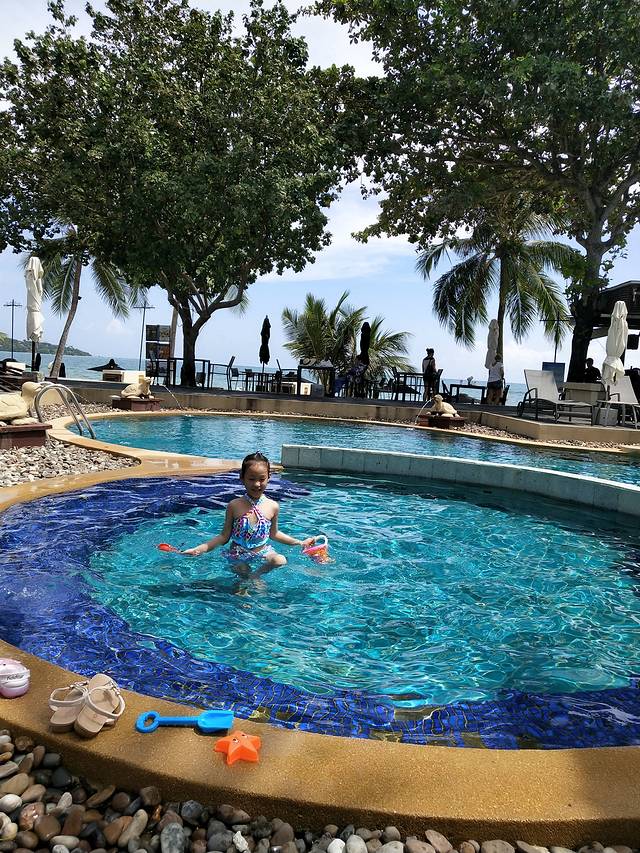 办理入住后差不多10点了,酒店人员都会简单的中文,交流问题不大,也帮我们把行李送到房间,酒店早餐11点才结束,入住早了还可以趁顿免费早餐,5岁半的孩子不含早,单独给了250泰铢一天,有点小贵,不过早餐很值,中西结合,照顾了大众的口味。这一天我们主要是在酒店玩,孩子很快换上了泳衣去泳池,泳池到海滩几步路,我们在酒店外面的小商店买了一个桶,孩子玩沙子的标配。孩子见不得水,在泳池不想出来,很多外国人也带着孩子在那玩,她胆小,不敢跟人家说话,又想一块玩。我和妈妈坐在沙滩、或是泳池边的躺椅上休息,太阳一来又赶紧换位置,而人家老外不打伞,穿着比基尼,特意趴那晒,甚至还把几个月大的孩子抱海里一起玩水,我也不会游泳,只能带着孩子在泳池边、海滩边玩水,也不敢下海。