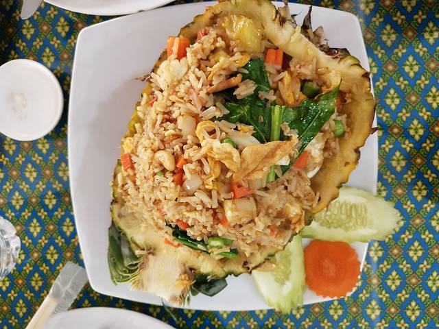 我一整个下午都在对比导游发的一日游行程和网上的,看内容、看价格,毕竟有老人和孩子,得考虑他们的适应能力。导游一直强调别自己出去跟团,出了事不负责,这边翻译要多少钱一个小时,我也有点虚,决定第2天在导游那订个丛林探险看下效果。在酒店玩到3点半有点小饿了,点了一份意面、一份海鲜炒饭、一份吓,970泰铢,味道一般,分量少,果断决定晚上出去吃。晚上出门时已经天黑,附近走了一截,没看到合适的,回来再酒店对面一家餐馆,几乎没人,老板会中文,贴心地给我们提供了筷子,照样点了海鲜炒饭,还有吓、包菜、汤,分量足、味道好,最后还没吃完,一共才540泰铢。由于头一晚基本上没睡觉,回酒店洗完澡孩子很快就睡着了,我洗好衣服上床才9点,妈妈跟我有点不适应,一晚上醒了好几次。