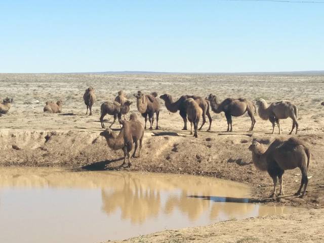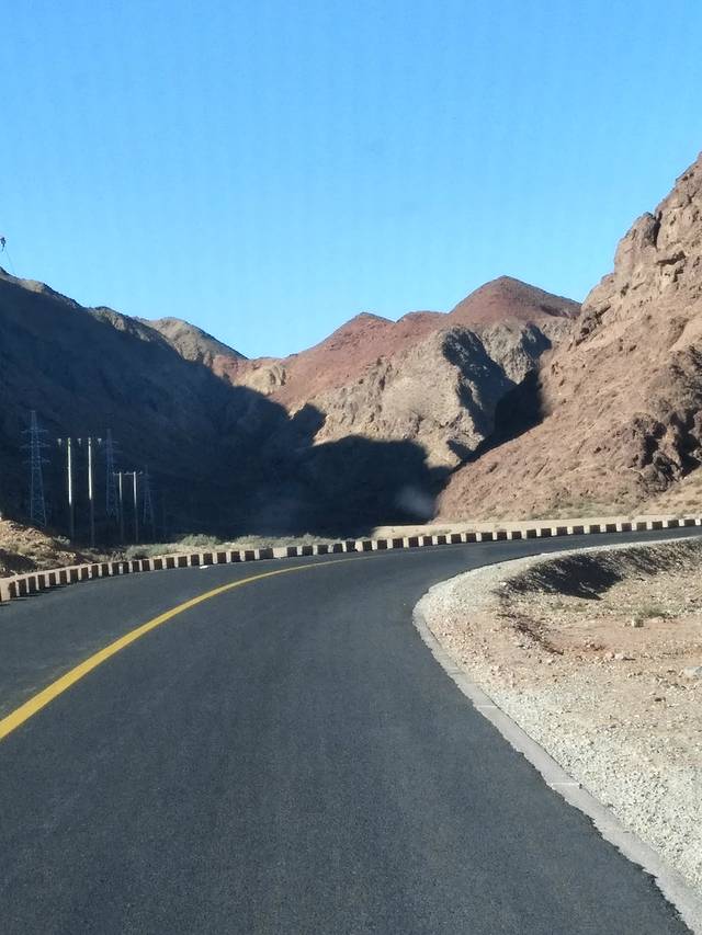 早晨6:30从蓝宇饭店出发,走G6、213省道、312省道(可以直接走G7到额济纳,由于汽车导航没有更新,选择的是省道),国庆期间312省道正在修路,10月8日正式开通道路,我们是7号过去的,公路刚刚修好,已经可以通车了。进312省道之前要加满油,这条约170公里的路没有服务区。行驶在崭新的公路上,经过人根峰景区,绕过一座座山丘,公路两旁一望无际的草原和沙漠,路边喝水的骆驼群,蜿蜒的公路和彩色山脉,景色非常美。一路上没有人烟,偶尔会迎面碰到一辆车过来,我们边开车边玩,看到美景就停下车拍照。