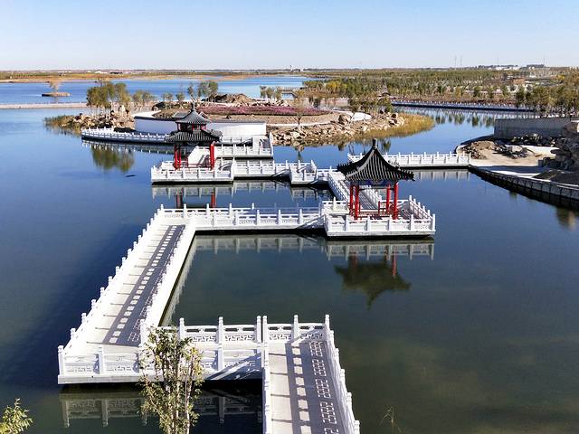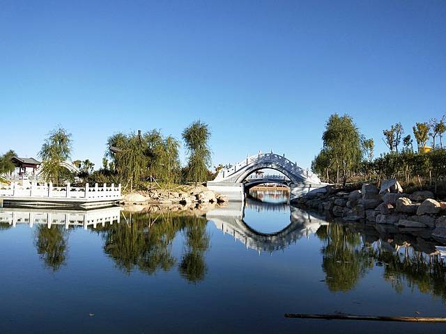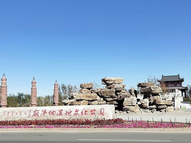 在前一天晚上散步时,偶然发现宾馆附近有一个正在建设中的额济纳湿地文化公园。上午,我们走进了公园,公园面积非常大,仿江南的建筑,楼阁亭台,小桥流水,景色美丽,环境幽静。原计划游玩2个小时,但是我们被眼前的美景吸引住了,竟然又玩了半天。