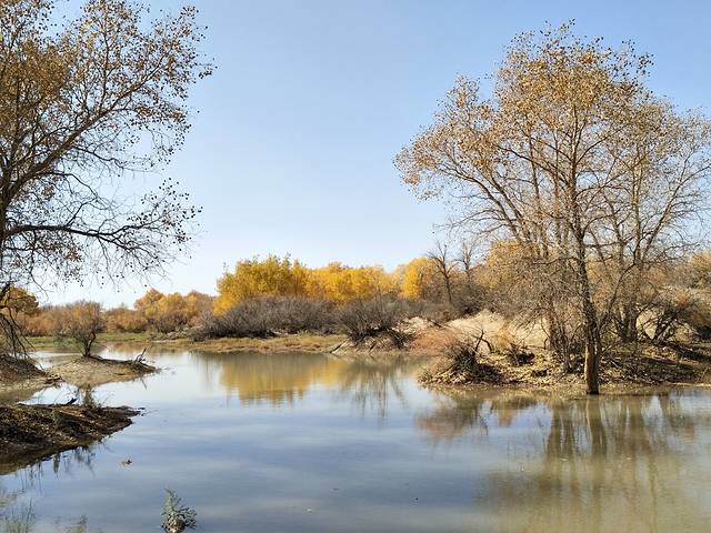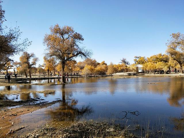 七道桥——梦境林,入口和出口不在一处,全程不走回头路,景区介绍是直线距离1.5公里,但是一路上随着栈道边走边拍照,我们用了将近3个小时。七道桥的胡杨树进口处不是很美,部分胡杨树的叶子已经枯了,随着景区的深入,景色越来越好。金色的胡杨,蜿蜒的湖泊,走在其中真如景区名字一般如在梦境中。