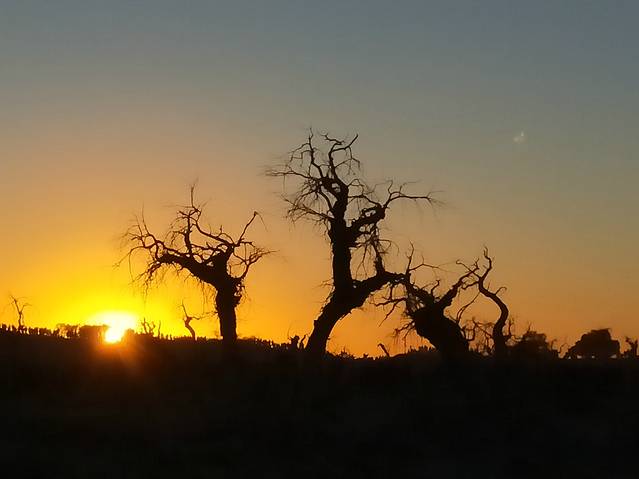 我们选择的是轻松2日游胡杨林,购买三日票350元/张,早晨6点进入景区,并采集手纹。乘坐景区车大约40分钟到八道桥——阿拉善沙漠地质公园看日出,日出时间大约7:20左右。