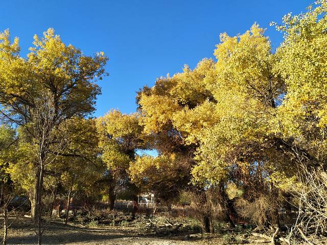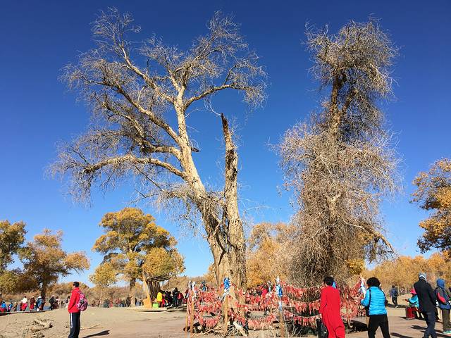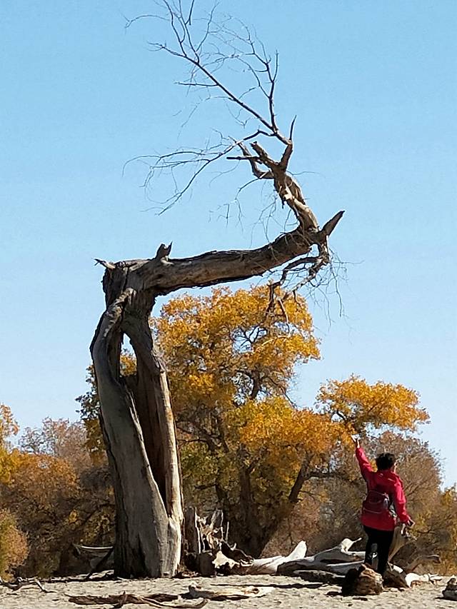 午餐后,驾车去神树景区,约40分钟。一路上道路两旁都是金灿灿的胡杨树和红柳树,真是风景在路上。神树景区门票10元,一棵880年的胡杨树,堪称额济纳胡杨树之王。景区非常小,游玩半小时即可。