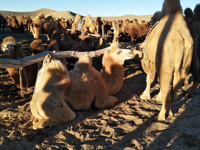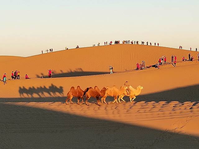 太阳照射在沙漠上呈现出金黄色的美景,游客们在沙漠上尽情拍照,一对对骆驼走在沙漠上,供游客骑行。
