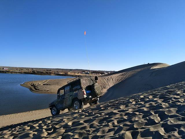 八道桥有许多游乐设施,骑骆驼、滑沙、坐越野车等,但大部分游客看完日出都赶往四道桥,很少有人玩,另外沙漠西边有一片胡泊,湖水蔚蓝。湖面上有一丛丛不知道名字的水生植物,甚是好看。没有其他游客,我们肆意地在沙滩上玩耍、拍照,欣赏美景。