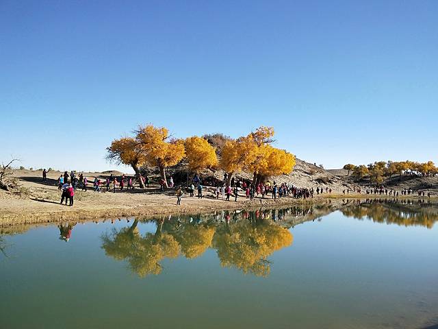 第一站乘坐景区大巴车到黑城遗址,登上黑城遗址,远眺弱水湖,清澈的湖面,金黄的胡杨树,形成一幅美丽的画卷。黑城遗址就是一道城墙,10分钟即可下来。然后乘坐景区电瓶车5分钟到弱水湖。弱水湖人很多,如果不坐电瓶车步行走过一条小桥,可以到湖对面欣赏胡杨林,那里的人很少。弱水湖的胡杨林奇形怪状,已经呈金黄色,游客们大多穿着红色的服装拍照留念。从弱水湖出来继续做电瓶车回到黑城遗址,然后倒乘景区大巴车到怪树林景区,按照景区游览图观赏各个景点,然后再怪树林欣赏日落,怪树林的日落很美。