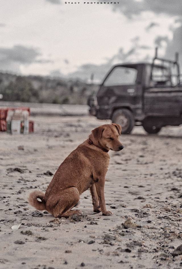 ▲三只狗狗随主人跑来海边,其他两只都下海玩水,唯有他迟迟不愿下去,蹲坐在沙滩上眯着眼。