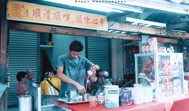 ▲做奶茶的男子。他娴熟的将各种调料倒入杯中,最后将奶茶装入一个类似保鲜袋的袋中,束扎好即是成品。他身后坐着一群当地华人,围成一桌开茶话会。