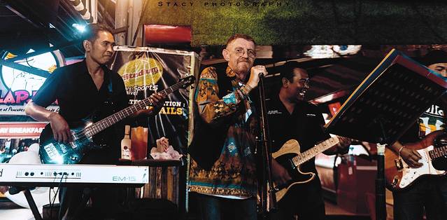 拿着话筒的是一位 美国 客人。大概是喝酒助兴,他攥着酒瓶就站上了台,主唱笑着退到后方。老人轻哼了一首和弦,乐队跟着老人缓缓奏着。歌词是即兴的,是对台下老伴的深情告白。一些琐碎的短句,真挚而热忱。他的眼里只有面前把一辈子都嫁给了他的女人。