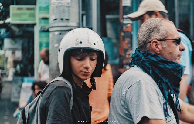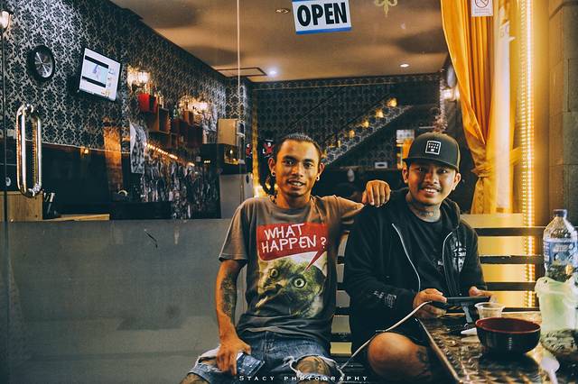 路过一家名为SORRY MOM TATTOO的纹身店 ,店门口一坐一蹲着两个花臂纹身师。我觉得店名甚有趣,便用手机站在对面随意咔了一张。结果蹲在地上的那个纹身师向我吆喝要我过去给他拍照,哈,我自是满心欢喜啦!花臂,耳朵上有耳扩,脖子上串着大珠链。我过马路到店前,给他们俩人拍了几张,看了之后连连说cool。