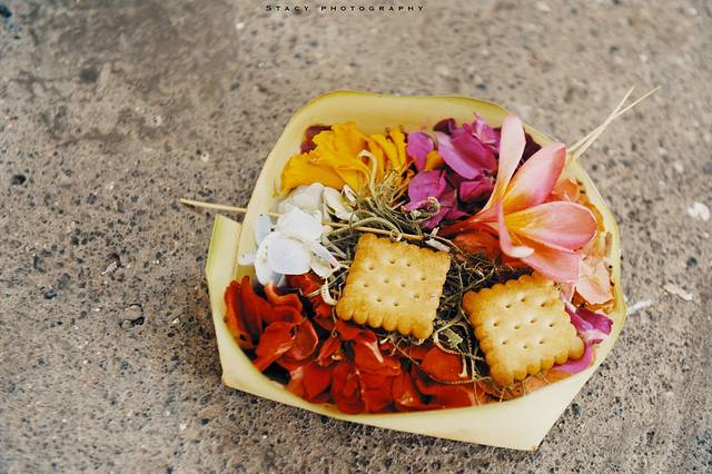 酒店门口的地上摆放着这样一个小纸盒,里面盛着饼干,干花和野草,散发着淡淡的檀香味,有店员蹲到纸盒前洒香做祈祷。这样的纸盒在印尼本地十分常见,每日早晨当地人都会做好一个新的,大概是信仰的一种仪式。遗憾的是它叫什么我至今不知道,搜了很多都没搜到类同物。