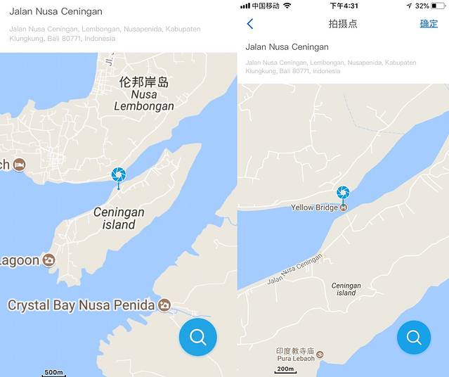▲把圆圈内放大了看, 蓝梦岛 即为Nusa Lembongan,下方的Nusa Ceningan即金银岛。我们的民宿在金银岛的西南角,绝妙的日落观赏点。