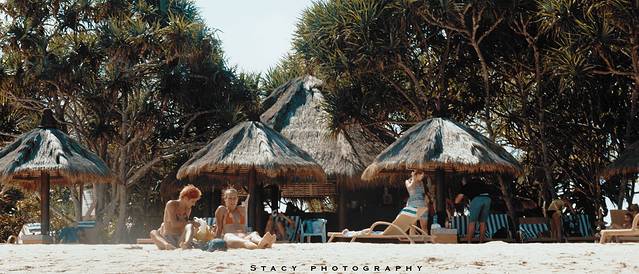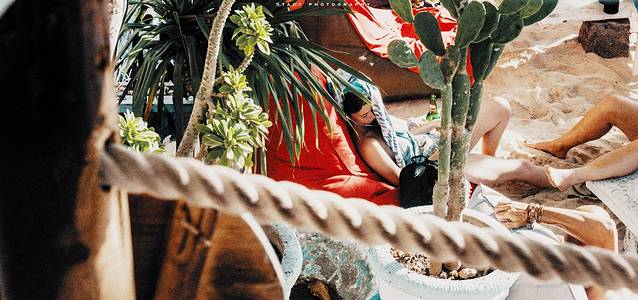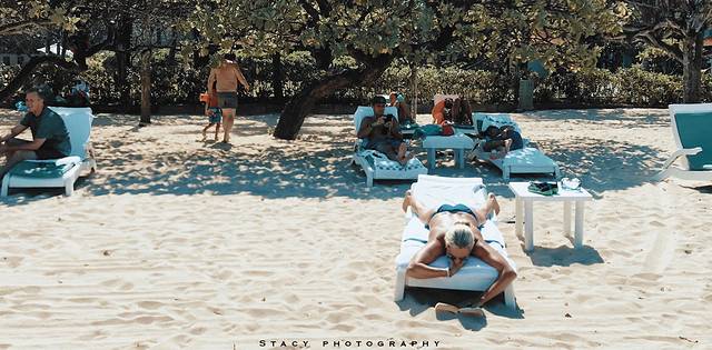 海滩上三三两两躺着晒 日光 浴的白人,有的捧着书,有的端着冰饮,有的只是趴着,惬意十足。树丛边支起了蓝色的阳伞,若干带有绿色沙发软垫的躺椅摆在一边。