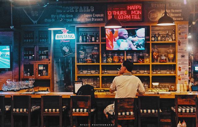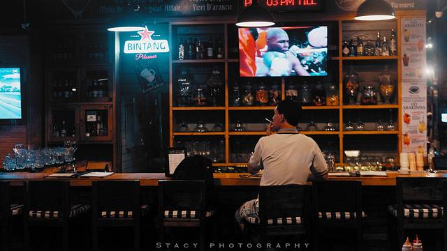 ▲酒吧里独自抽烟看拳赛的男人。