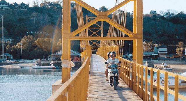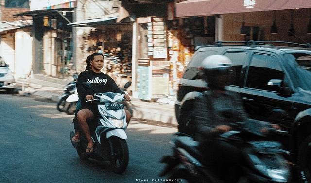 巴厘岛 和金银岛都是是摩托天堂,不宽的道路上全是接近生死时速的摩托客。赤足和踩拖鞋是常态,一切盖过了脚背的鞋子都几乎没有出现。有些上初高中的孩子开摩托上学,三三两两有说有笑,白色的制服扎在黑色的西装短裤里。