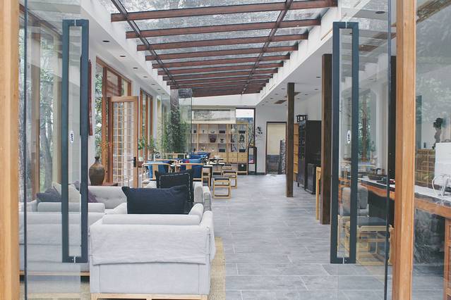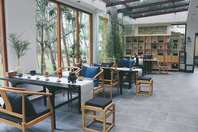 进入民宿,首先看到的是透明玻璃茶座里的一颗松树拔地而起,设计师巧妙的利用了松树林里原本的松树,并很好的保护了起来,跟民宿融为一体。阳光照进来,隐隐绰绰的树影倒映在地上,让整个空间更多了一份恬静与和谐。