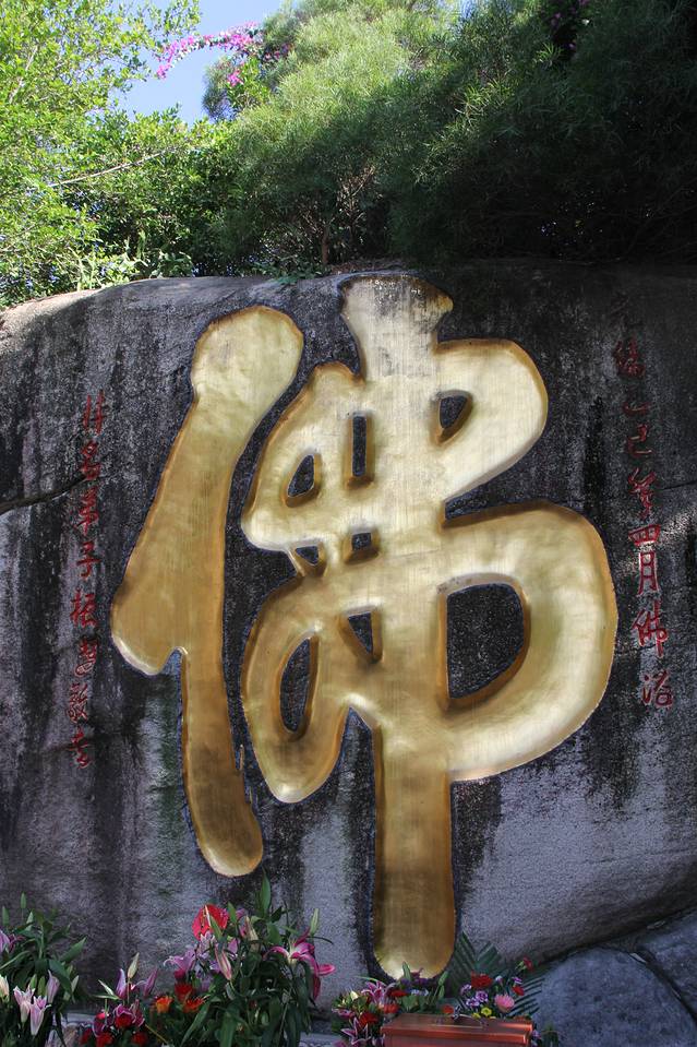 五老峰位于南普陀寺后面五个山头,海拔184.8m,从藏经阁后面登阶,山坡上镌刻着"五老峰"三字,迎面巨石上刻着特大的"佛"字,高4米多,宽3米多,笔划丰满有力,粗犷豪放,似乎大笔一挥而就。这就是清光绪年间(1905年)振慧和尚所书。它吸引了许多善男信女来此烧香磕头。登顶需一个小时,站在山顶眺望远方,天海相连寺院、厦门大学和鼓浪屿尽收眼底。