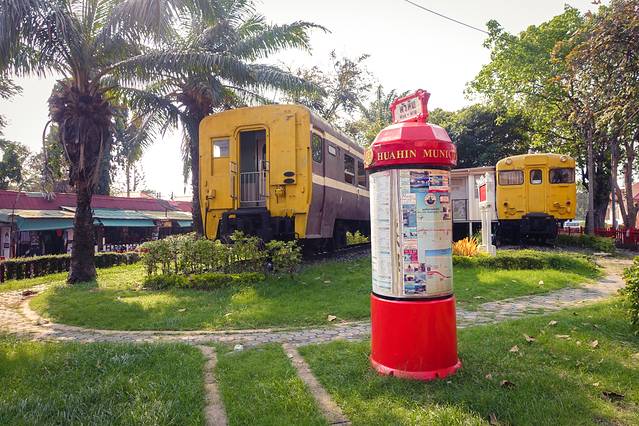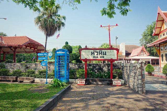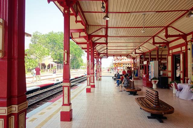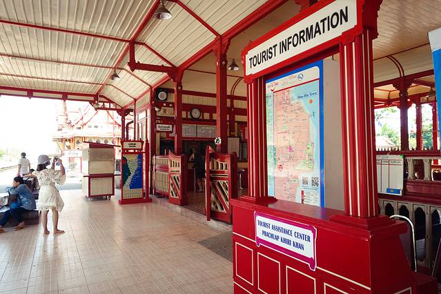华欣火车站建于1911年拉玛六世时期,是泰国最老的火车站之一,更有泰国最美的火车站之称。红、淡黄两色搭配呈现出简洁而高贵的泰国宫殿气质,宁静而优雅。若无铁轨,很难想象出这竟是火车站。至今,这里依然保留着为了欢迎皇室访问华欣所建造的皇家等候区。上火车站并没有设检票口,因此成为游客来到华欣最爱摄影留念的地方。