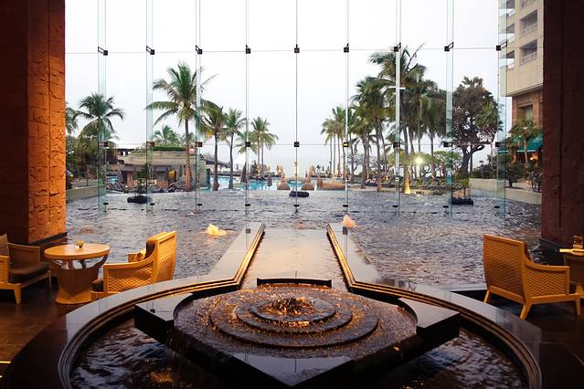 华欣希尔顿温泉度假酒店是华欣的地标建筑,离火车站和夜市很近。酒店拥有华欣好的海滩和风景,硬件和服务秉承希尔顿一贯的高品质,早餐也特别丰盛。刚进去就会有服务人员送上冰饮料和冰毛巾,拂去旅途奔波的劳累,并且登记完后会将你的行李送到房间。在泰国服务是要给消费的哦20泰铢就行了,也别给太多,反而会被人笑话。