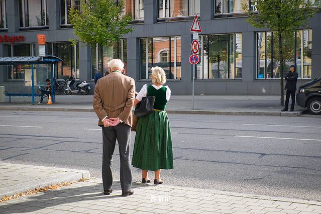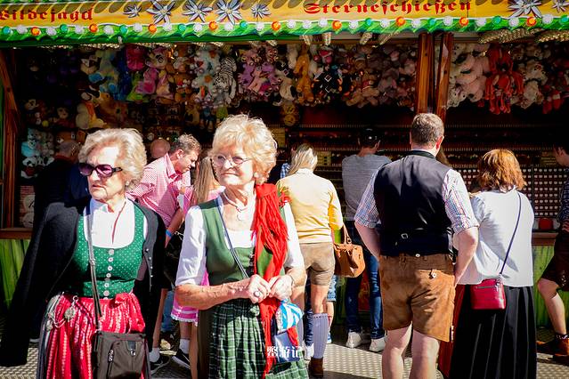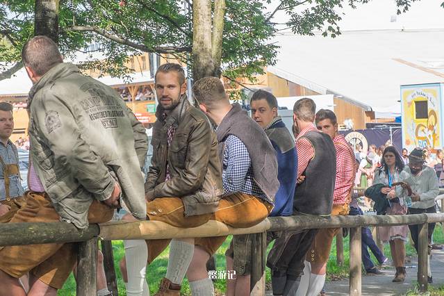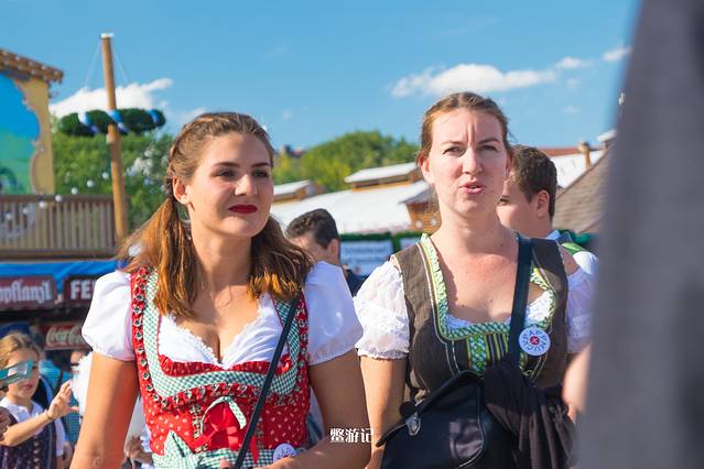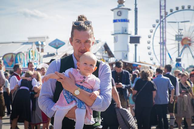 在机场取车导航到至啤酒节的现场“特蕾泽”草地(Theresienwiese),就看到熙熙攘攘的举着啤酒杯畅饮欢腾的人们,从尚在怀抱中的婴儿到头发花白的老妇,白、黄、黑各种肤色夹杂其中,许多人都穿着德国本地传统服装。