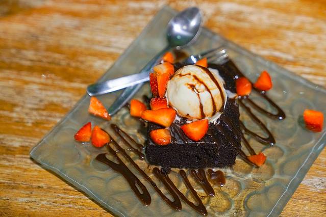 边吃边聊,一不留神夜已深了,还好我们还有甜品时间。素食主义者也可以吃的 布朗 尼 里加 入了生可可、天然的棕榈糖、腰果牛奶和核桃仁,最上面是餐厅自制的椰子冰淇淋,再加上新鲜的草莓,口感层次特别丰富。热带水果挞里都是 巴厘岛 当季最新鲜的水果,充盈着热带海岛的香气。