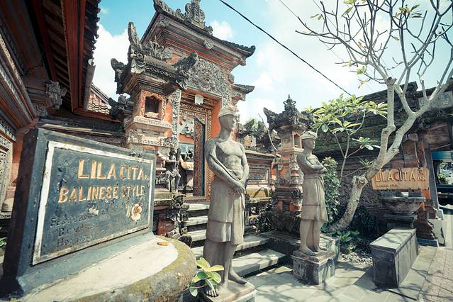 早上九点从 北京 出发,经历了7个半小时的直飞,傍晚时分抵达 巴厘岛 机场。已经提前联系好乌龟包车的接机,司机是个幽默的当地小伙,一路和他调侃着 巴厘岛 的交通堵塞,大约1个半小时的时间就开到了此行的第一个落脚点:乌布的家庭旅馆【Lila Cita Inn balinese style】。华灯初上,两个典型 巴厘岛 风格的人像雕塑在门口欢迎我们,门口精致的雕刻让人恍然如同住进了岛上的寺庙里。