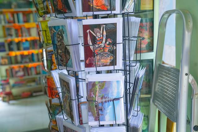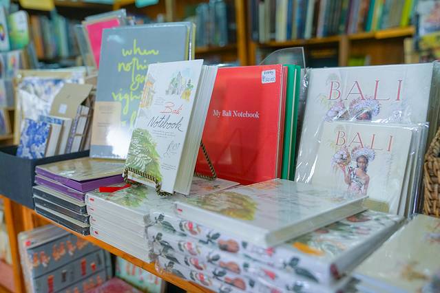 除了书籍,店里还有一系列以 印度尼西亚 为主题的复制地图、印刷品、明信片、贺卡、海报、书签、拼图等。特别是明信片,和外面大部分印着 巴厘岛 风光的明信片不同,这里有很多明信片的内容是 巴厘岛 当地的画作,很有收藏和纪念意义。喜欢做旅行手帐的我自然也没错过店里为数不少的手笔记本。笔记本上有的画着淡彩的 巴厘岛 风景,有的用复古牛皮装帧,还是很有自己的风格的。