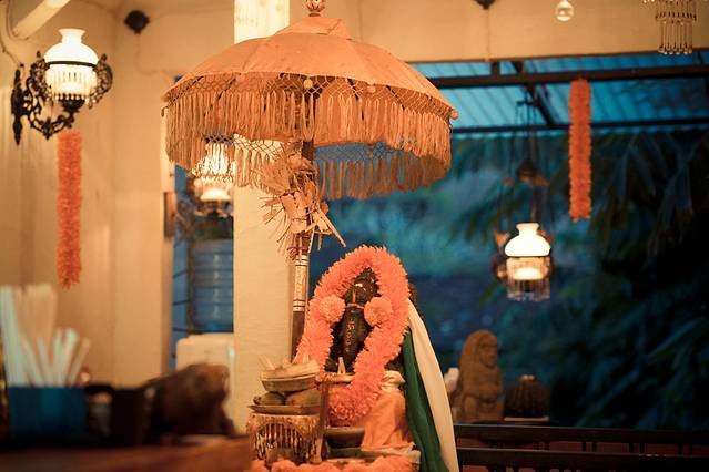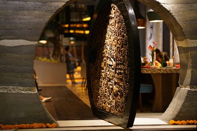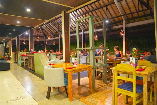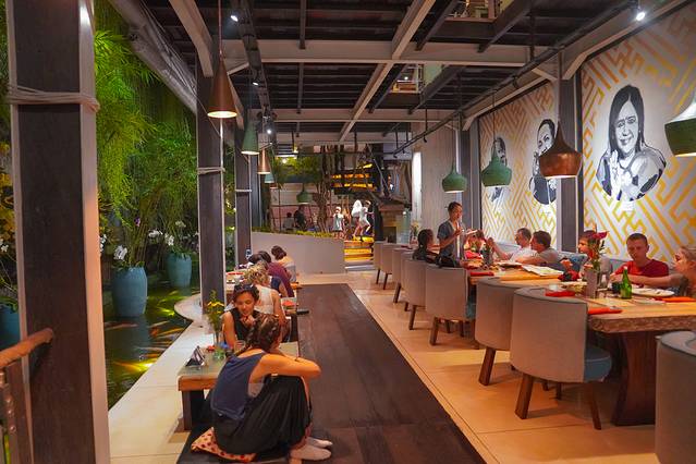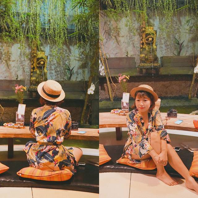台阶上布满鲜花,可旋转的小圆门好像霍比特人里的mini小屋。入内需要脱鞋,门口有可以储存鞋的柜子。进门后左手边是一个颇有禅意的池塘,里面的锦鲤个个肥大,墙上带有典型 巴厘岛 元素的雕刻掩映在从二楼垂下的绿植中。这边的座位是席地而坐的,很是惬意。右手边是一排极有质感的沙发座椅,墙上挂着各种漫画风格的黑白人像,显得个性十足。连接两个楼层的是一部树藤缠绕的旋转式楼梯,特别有设计感。