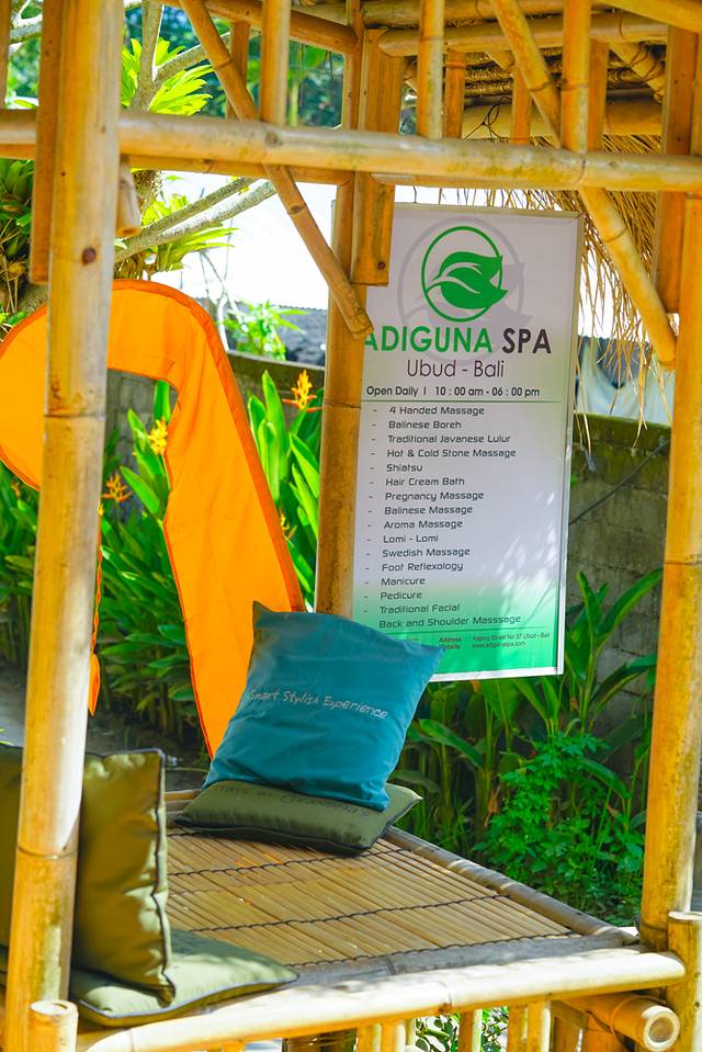 在去稻田的路上,我们就已经瞄准了一家卡姜街上的SPA馆。Adiguna Spa离商铺集中的区域稍微有点距离,但又没到稻田。竹屋木椅茅草顶,很有返璞归真的感觉。回来的路上就果断去里面放松了。