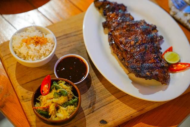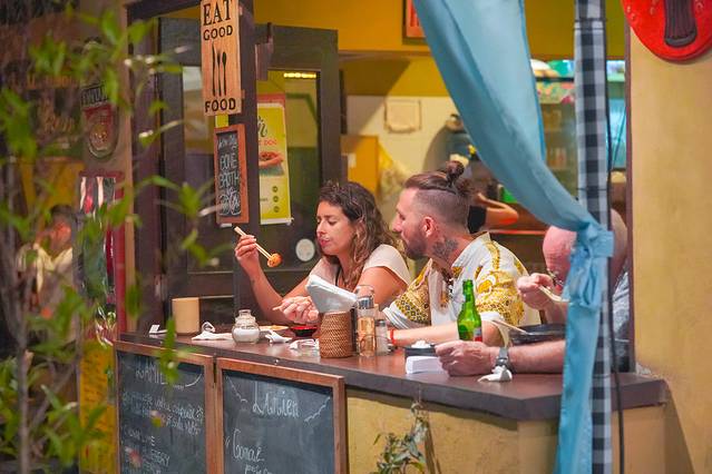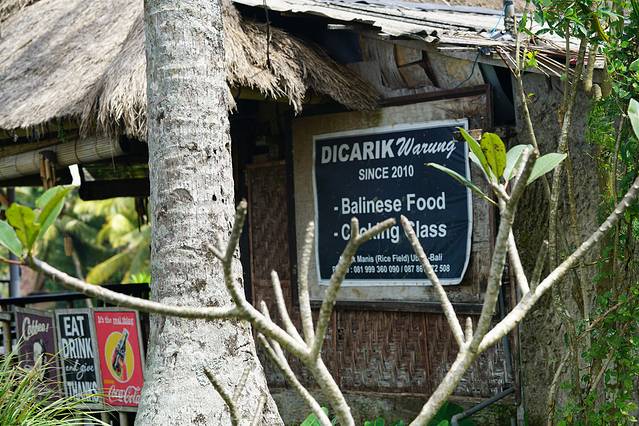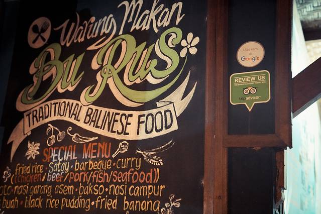 出门前旅馆老板为我们推荐了一家他们很喜欢的当地小馆Warung Makan Bu Rus,沿着旅馆所在的小街Sweta Street溜达过去大概要十分钟的时间。如果不是刚好看到了猫途鹰TripAdvisor绿色的标志,差点就和这家口碑超好的餐厅擦肩而过了。因为它的门脸看起来实在是一副门可罗雀的样子,走近几步,店员才会引导你通过一个小门进入真正的用餐区。入口隐藏的可真够深的!
